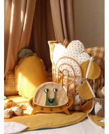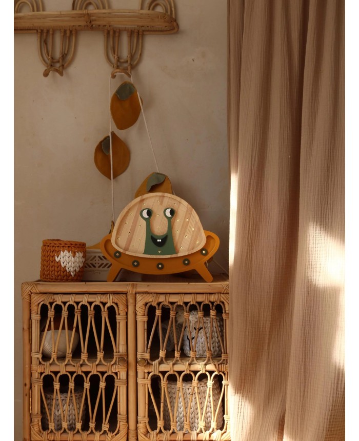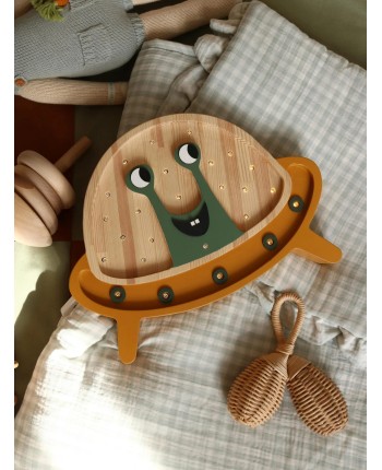 This fun alien-in-a-spaceship wooden night light brings playful cosmic energy into any child’s room. With its friendly green alien, striped wooden “helmet,” and bright orange saucer base dotted with warm lights, it creates a comforting glow that makes bedtime feel imaginative and joyful.